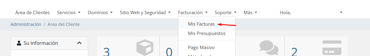 Desde tu área de clientes y accede a la opción de Facturación, posteriormente selecciona Mis Facturas: