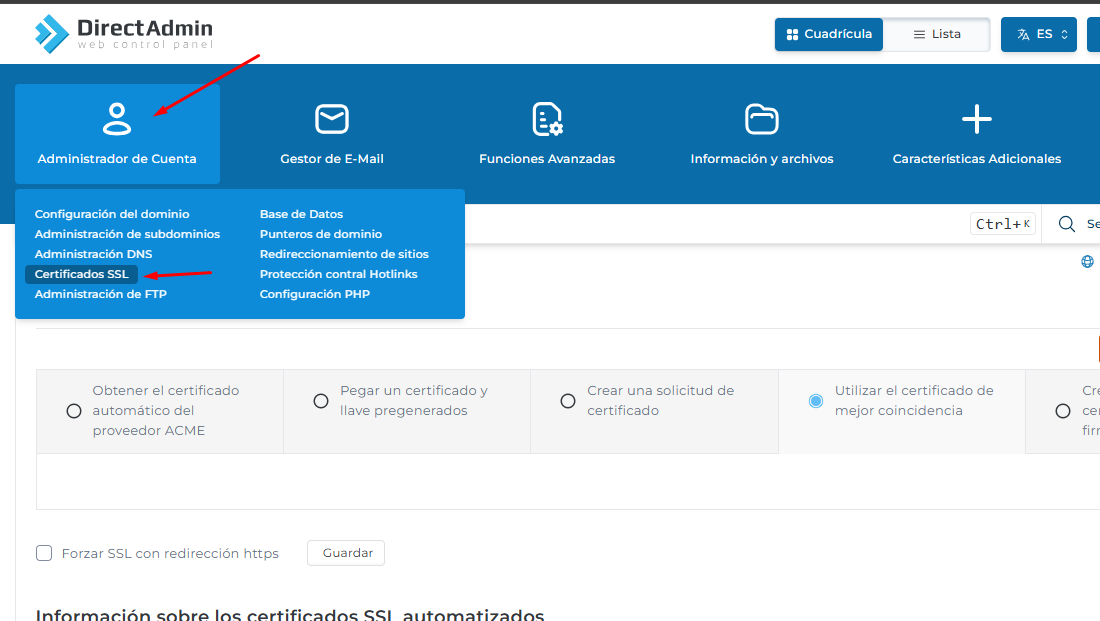 Una vez logueado, deberá ingresar a ADMINISTRADOR DE CUENTA luego haga click en CERTIFICADO SSL.