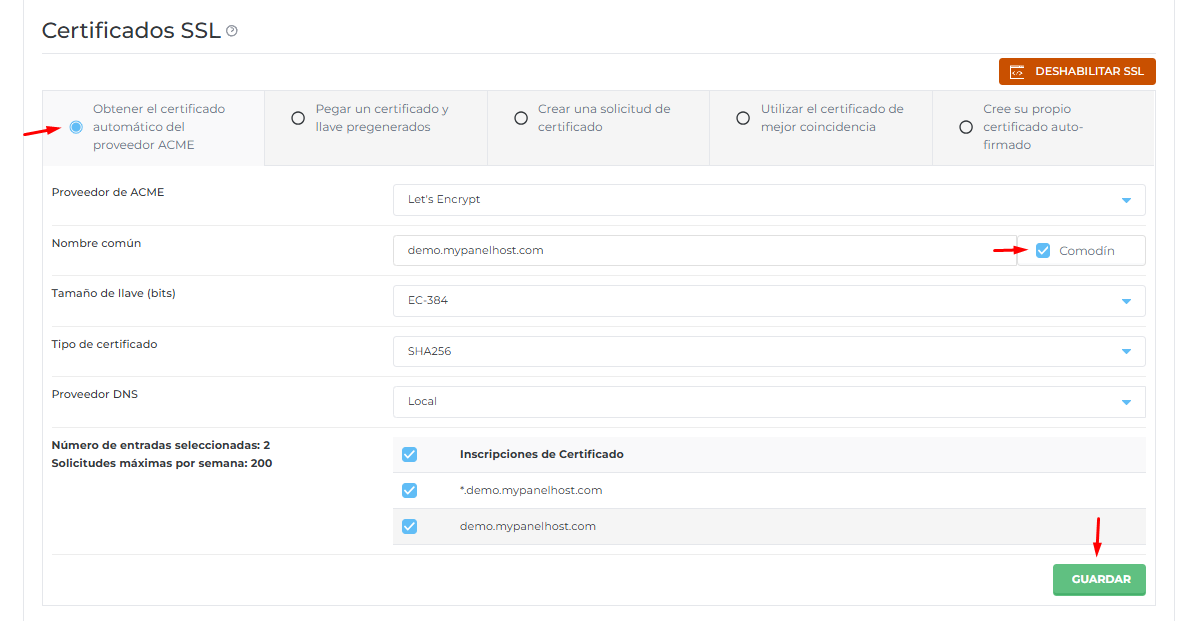 Posteriormente podrá ingresar y crear dicho certificado. Tendrá que hacer click en el punto 1, "Forzar SSL con redirección https" guardar.